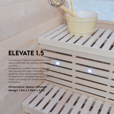 The 2-Tier Hanko sauna is equipped with a 4.5KW Harvia stove featuring an LCD control panel and Bluetooth functionality, along with app support for easy control. It also includes a 10cm high base support for the stove (RBCO). With dimensions of 1500 x 1350 2100, this sauna combines modern technology and comfort in a sleek design.