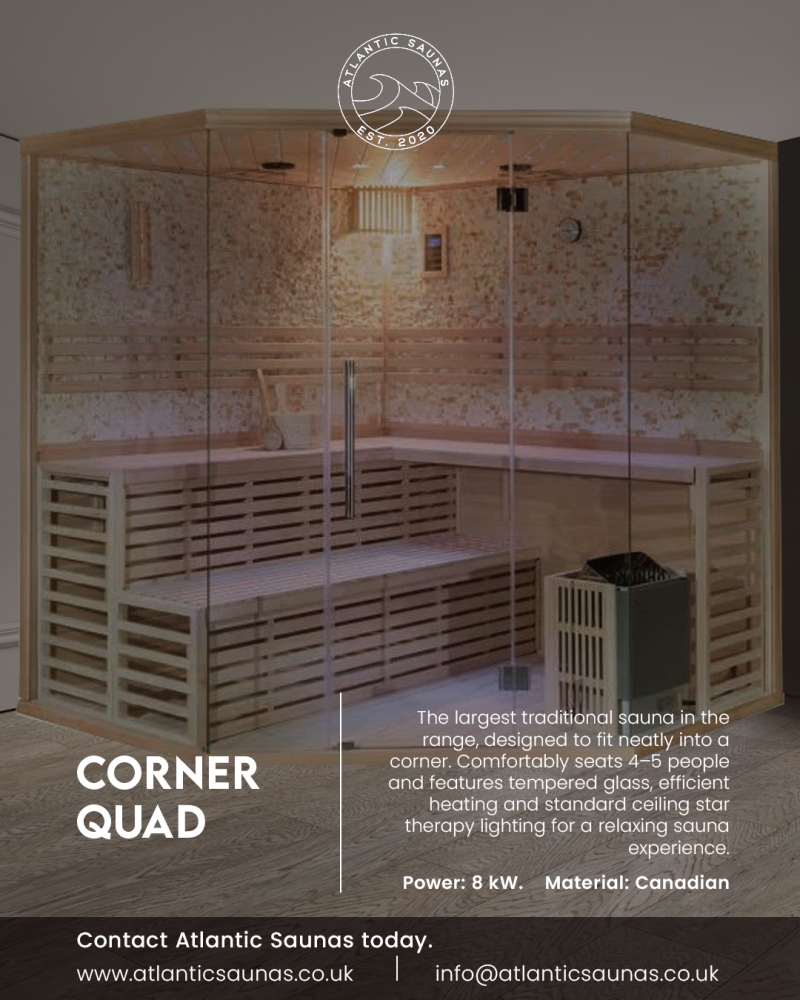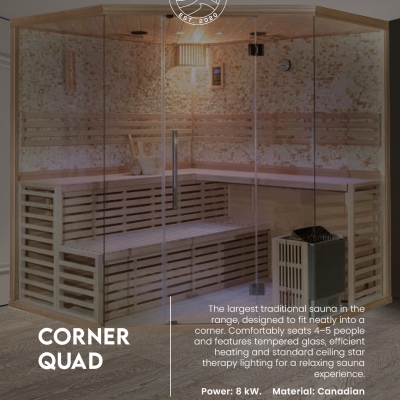Elevate your home wellness routine with the Corner Quad . Its blend of spacious design, high-quality materials, and an efficient heating system makes it an exceptional addition to any home. Whether you're seeking relaxation, health benefits, or a unique way to spend time with loved ones, the Corner Quad offers a superior sauna experience.