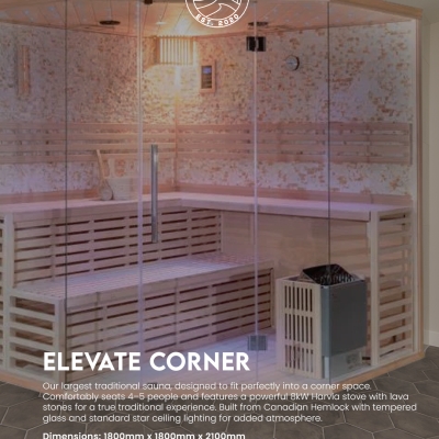 - Power: The Corner Quad is heated by a high-efficiency 8KW stove, accompanied by lava stones for an authentic and evenly distributed heat. This powerful heating system ensures a superior sauna experience, balancing efficiency with performance to deliver consistent warmth and comfort.