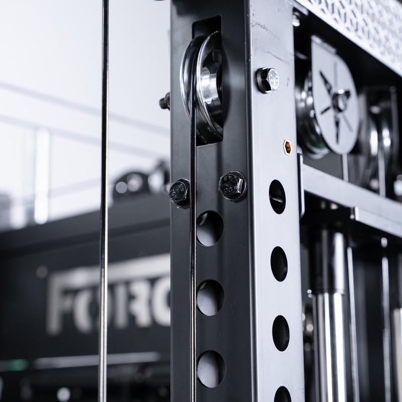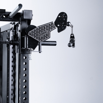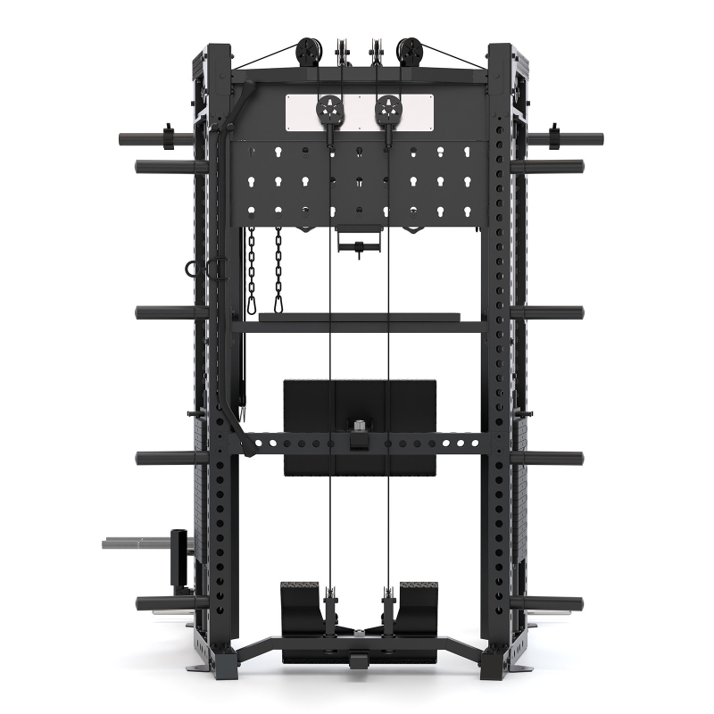 The uprights use thick 3x3 steel, the pulleys run smoothly thanks to their aluminium finish, and the reinforced locking system keeps everything steady while you rack heavy. Storage has also been properly thought through: a pegboard at the back, eight plate holders, a barbell holder and a shelf for your essentials. Add a multi-grip pull-up bar with adjustable handles, spotter arms that double as dip bars, and a suspension trainer hook, and you’ve got a seriously versatile machine that feels every bit as solid as it looks.