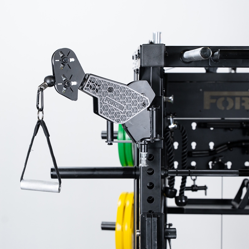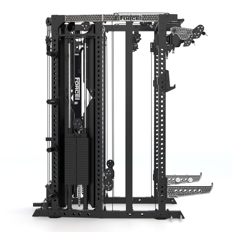 The Force USA C20 All-In-One Trainer takes the big pieces of gym equipment you’d usually spread across a room and pulls them into one compact, heavy-duty frame. At its core you get a Smith machine with smooth travel and proper IWF/IPF bar markings, a half rack with rock-solid J-hooks and spotters, and six pulley stations offering 1:1 and 2:1 ratios. Dual 90 kg weight stacks come as standard, each complete with handy micro plates for smaller jumps, and you can upgrade to 135 kg.