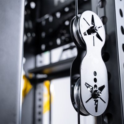 Two freestyle pulley arms, one on each upright, move up, down, and side to side on reversible cable trolleys. Two low pulleys at the base run a 1:1 ratio, set up for rows or to connect with the sliding bench (sold separately) for leg exercises. At the top, twin pulleys provide a 2:1 ratio each and can be linked for a 1:1 ratio on heavier pulls. The pulleys swivel through 180 degrees and can also be locked in place.