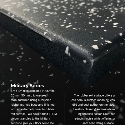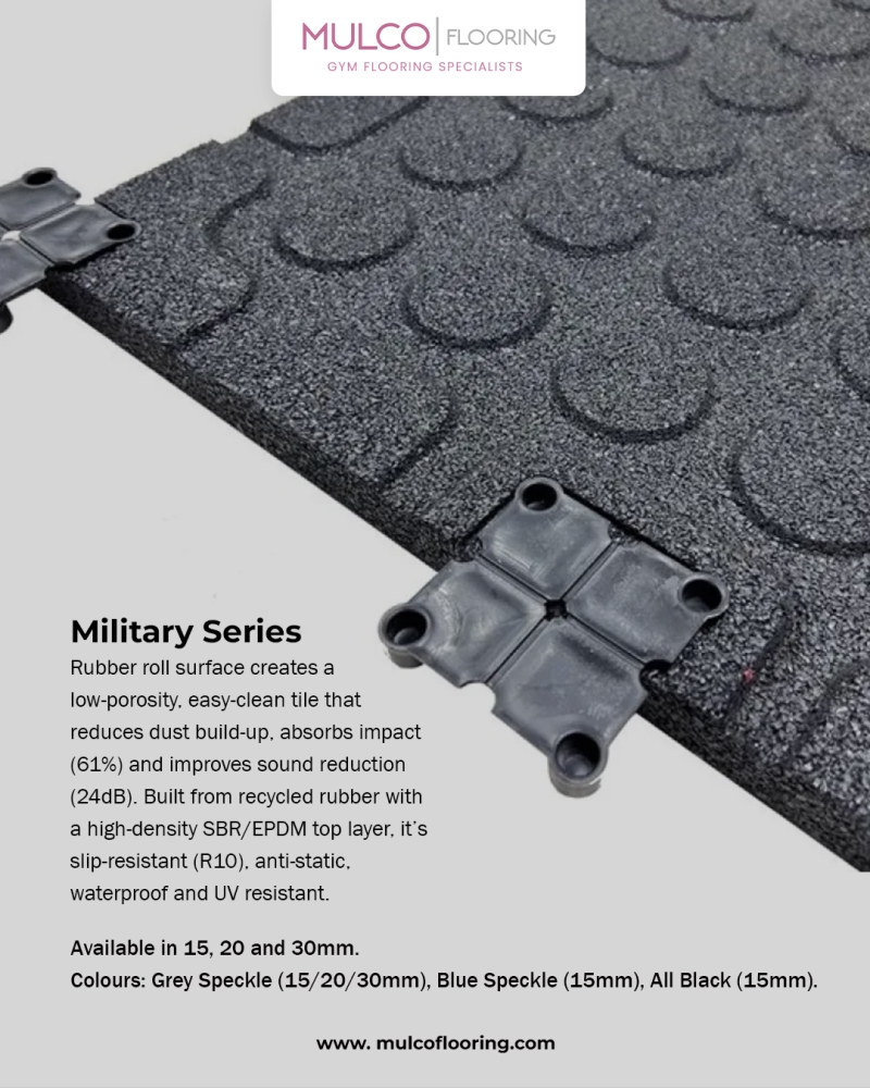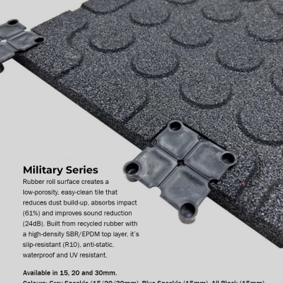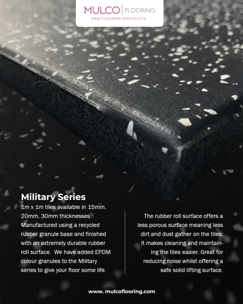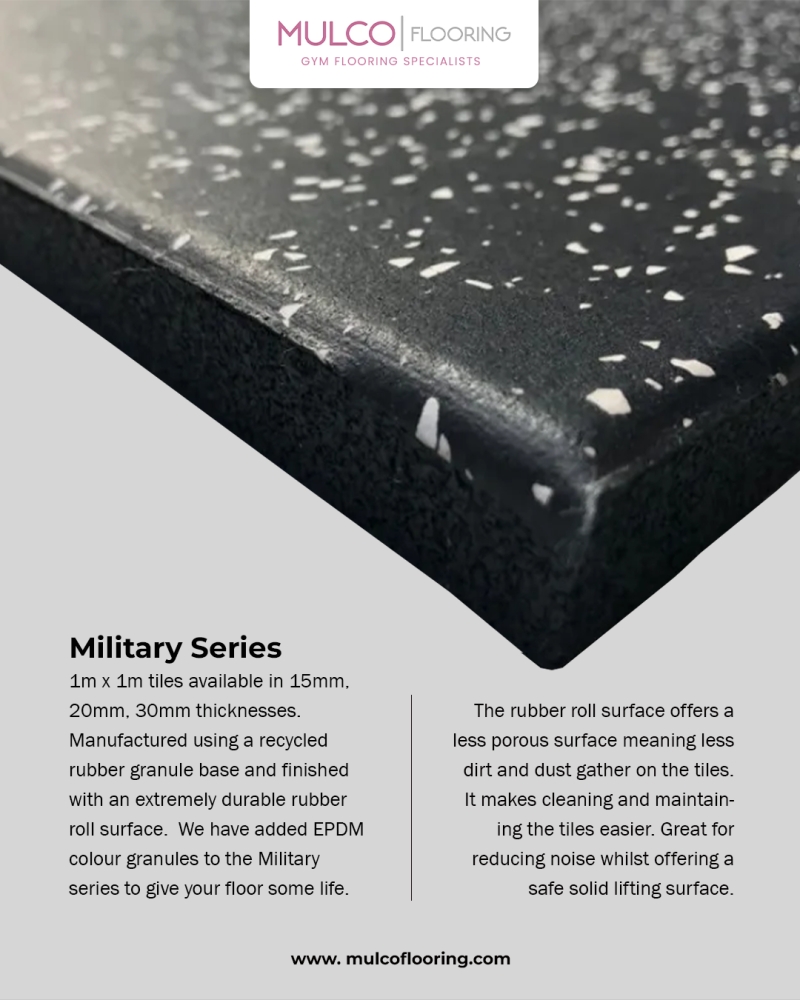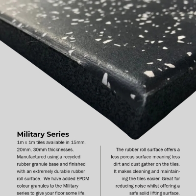 1m x 1m tiles available in 15mm, 20mm, 30mm thicknesses. Manufactured using a recycled rubber granule base and finished with an extremely durable rubber roll surface. We have added EPDM colour granules to the Essential series to give your floor some life.