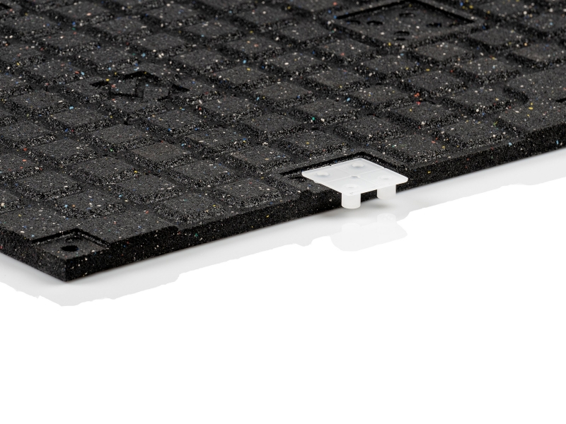 The Stockz patented impact bottom is specifically designed for optimal shock absorption and the reduction of impact sound. The structured pattern on the underside of the tile incorporates integrated connection holes for the connector system.