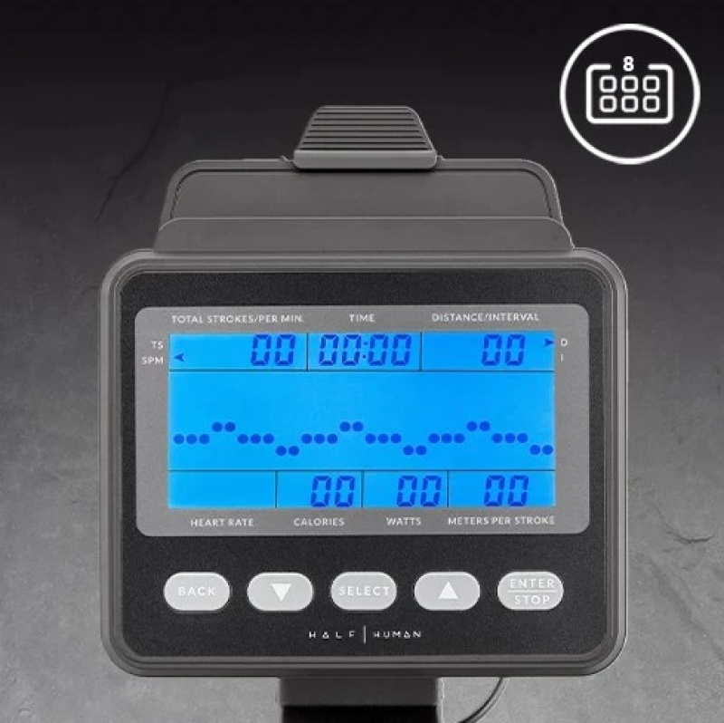 - Console: 5” backlit LCD screen Console Feedback: Strokes, time, distance, calories, heart rate, strokes per minute (SPM) Watts, metres per stroke, interval Programmes: 8 (manual, time, distance and calories countdown, 3 interval (20/10, 10/20, custom), Game)