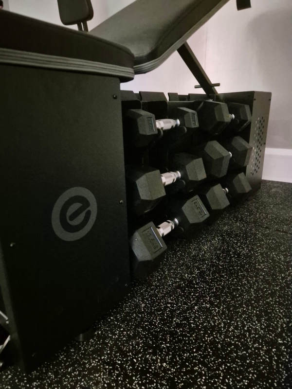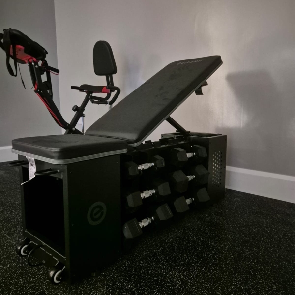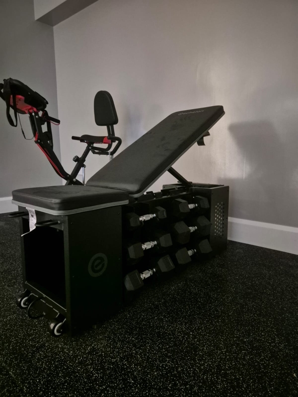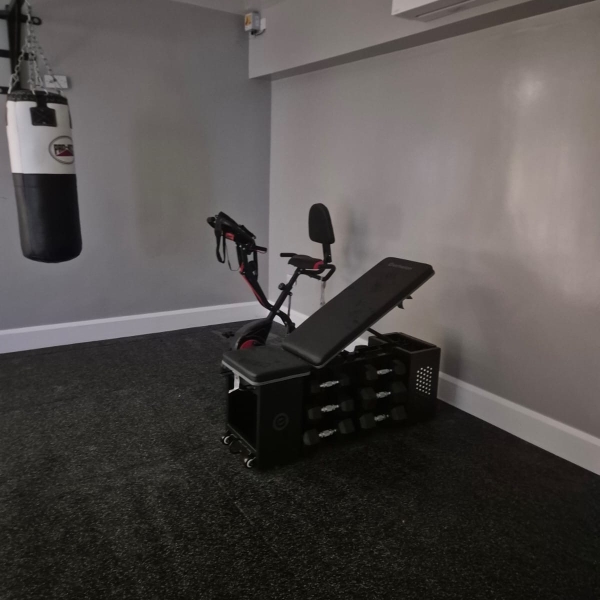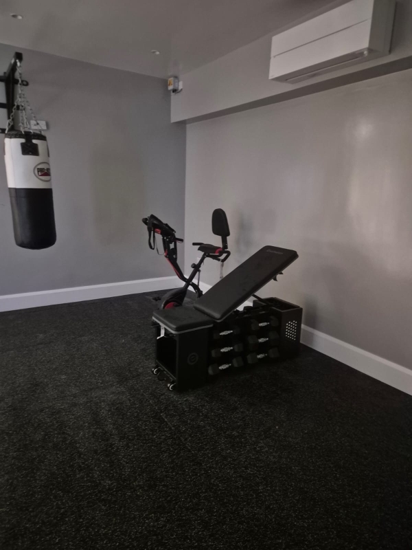A carefully curated selection of professional equipment enhances both performance and aesthetics. The installation includes a commercial-grade treadmill positioned to maximise natural light, a wall-mounted heavy bag for dynamic strength and conditioning, and a sleek stationary bike for low-impact cardiovascular training. An adjustable strength bench with discreet, integrated dumbbell storage provides a streamlined solution for weight training without compromising the clean visual lines of the room.