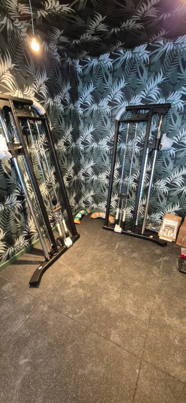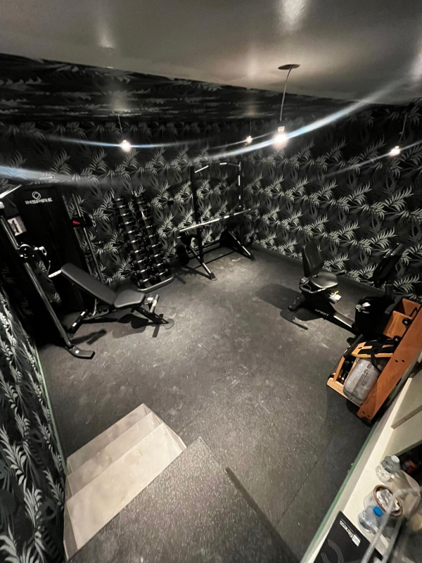 The home gym features a striking, modern design with bold patterned walls and durable rubber flooring. Combined with carefully positioned lighting and an efficient equipment layout, the space feels both motivating and seamlessly functional.